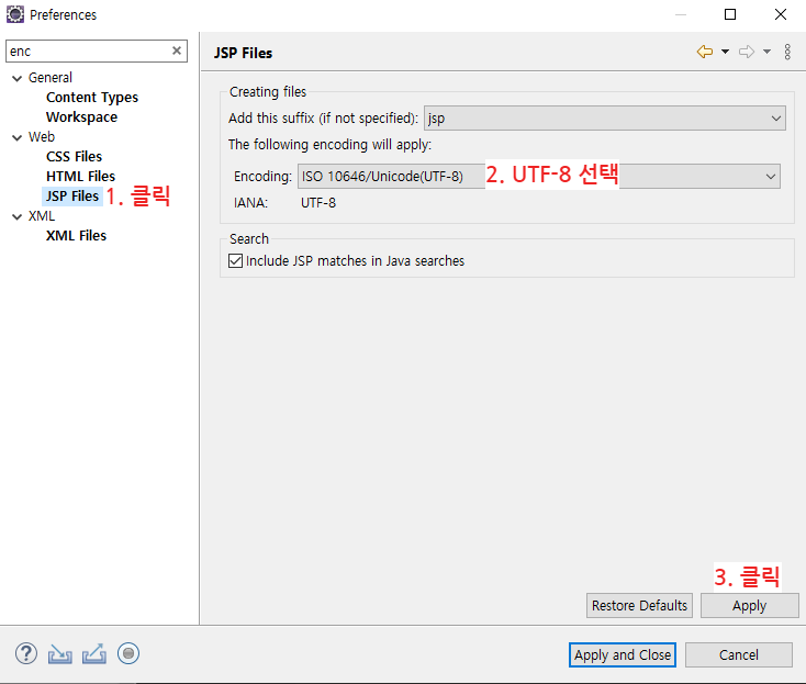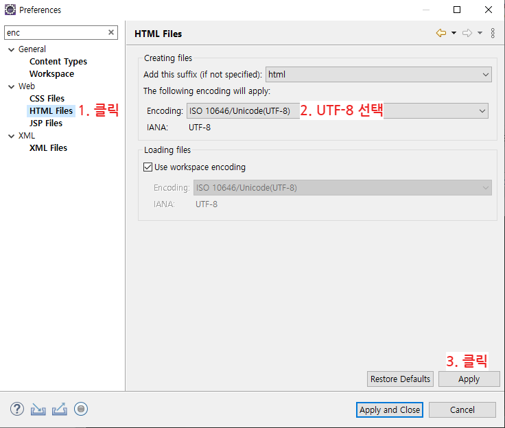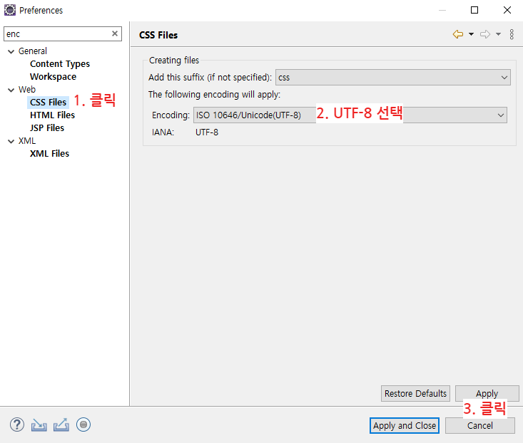 CSS Files, HTML Files, JSP Files νλͺ© κ°κ° ν΄λ¦ ν [ Encoding -> ISO 10646/UNICODE(UTF-8) μ€μ ] ν APPLY
