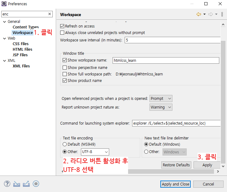 μΌμͺ½ λͺ©λ‘ [ Workspace ν΄λ¦ -> νλ¨ Text File encoding - Other μ²΄ν¬ ν UTF-8 μ€μ -> APPLY ]