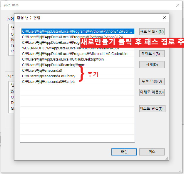 path ํธ์ง์ ์๋ก๋ง๋ค๊ธฐ๋ก anaconda3 ์ค์น ๊ฒฝ๋ก๋ฅผ ์ฐพ์์ ์ถ๊ฐํด์ค๋ค.
