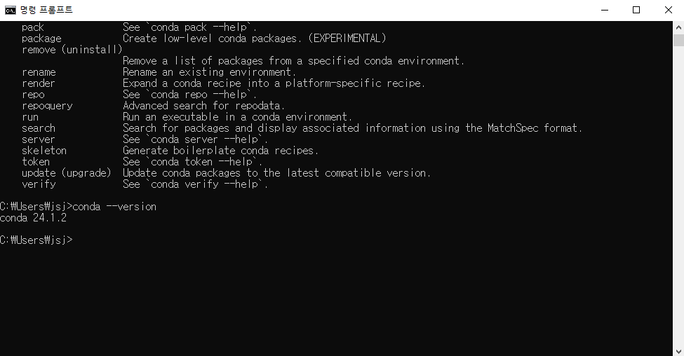 cmd(๋ช ๋ น ํ๋กฌํํธ) ์์ conda ์ ๋ ฅ์ conda ์ด์ฉ ์๋ด,